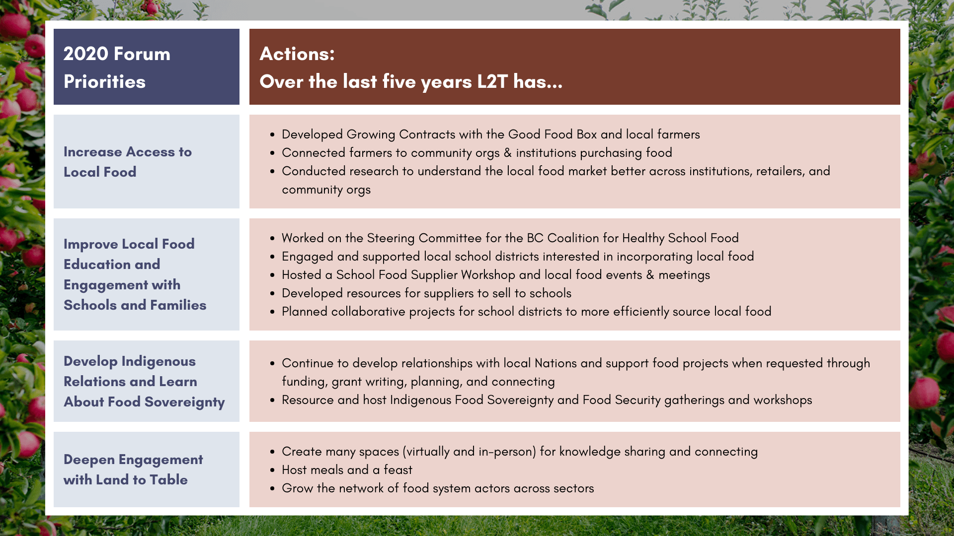 After our 2020 forum, one of the priorities was to incorporate “feasting” more into our food systems work. While L2T always tries to make delicious local food a part of our work, this event was our opportunity to gather our community partners around a table for a feast, both as a thank you for our network’s hard work and as a celebration. We shared an incredible Storytelling Feast by Smoke on the Plateau. kelsie kilawna (Marchand) led the group through a beautiful story, explaining sqilx’w food governance, where every dish carried the teachings of the Four Food Chiefs, skimxist (Black Bear), spitlem (Bitterroot), siya (Saskatoon), and ntytyix (Salmon). The incredible meal was a moment for reflection, gratitude, learning, and of course sharing in the joy of the delicious food that ties each of us to each other and to the land.